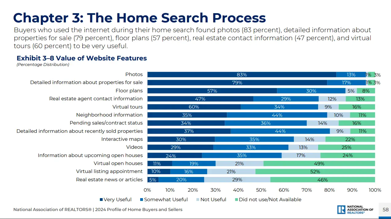 According to the National Association of REALTORS® 2024 Profile of Home Buyers and Sellers, 83% of home buyers say photos are the MOST valuable feature when browsing listings online — more than floor plans, virtual tours, or agent contact info.
